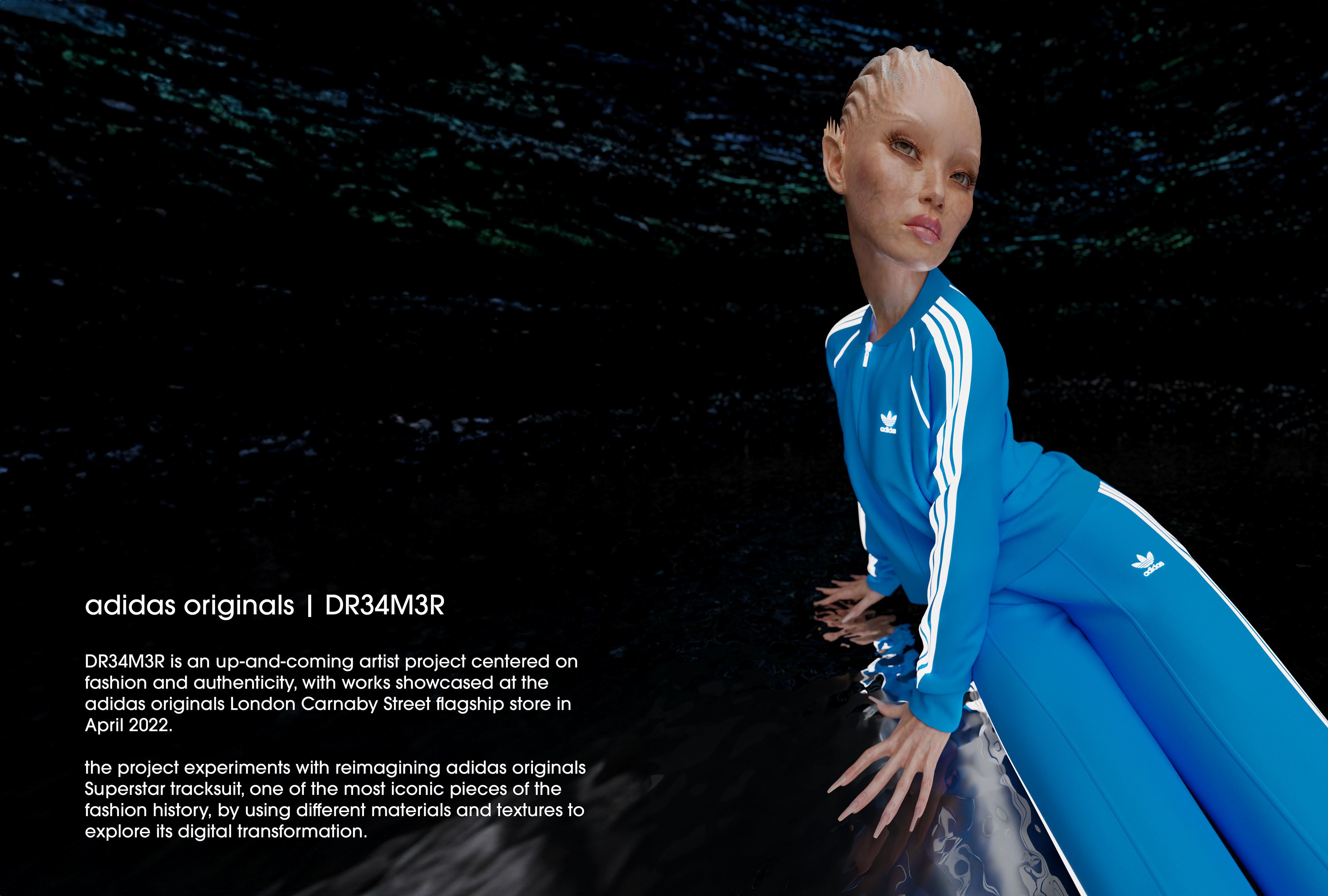 adidas originals | DR34M3R DR34M3R is an up-and-coming artist project centered on fashion and authenticity, with works showcased at the adidas originals London Carnaby Street flagship store in April 2022. the project experiments with reimagining adidas originals Superstar tracksuit, one of the most iconic pieces of the fashion history, by using different materials and textures to explore its digital transformation.