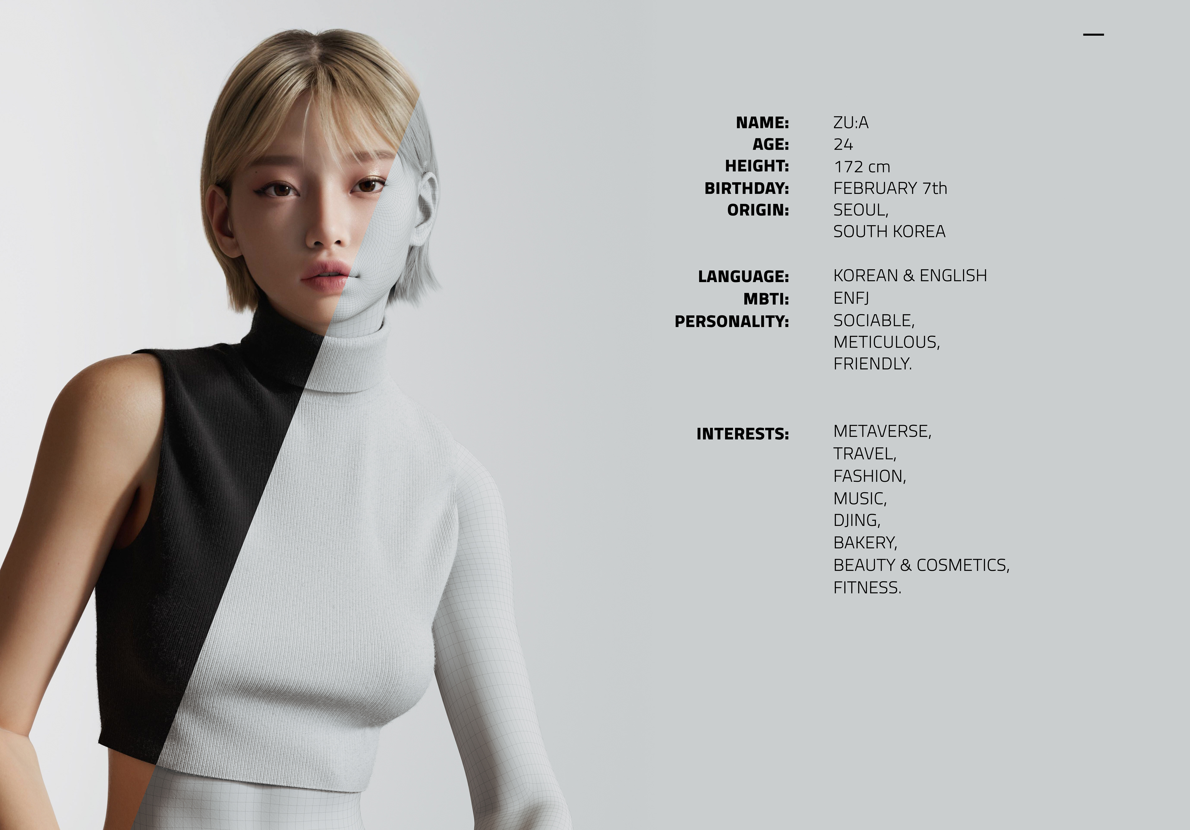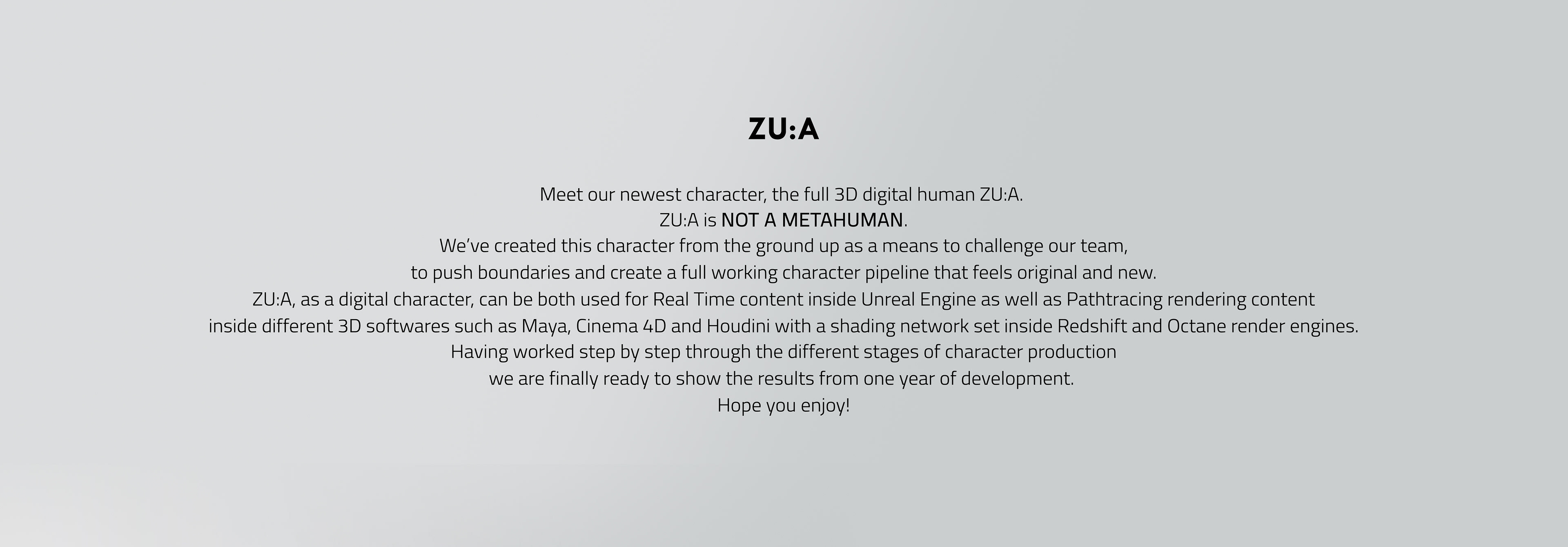 Meet our newest character, the full 3D digital human ZU:A. ZU:A is NOT A METAHUMAN.We’ve created this character from the ground up as a means to challenge our team, to push boundaries and create a full working character pipeline that feels original and new. ZU:A, as a digital character, can be both used for Real Time content inside Unreal Engine as well as Pathtracing rendering content inside different 3D softwares such as Maya, Cinema 4D and Houdini with a shading network set inside Redshift and Octane render engines. Having worked step by step through the different stages of character production we are finally ready to show the results from one year of development. Hope you enjoy